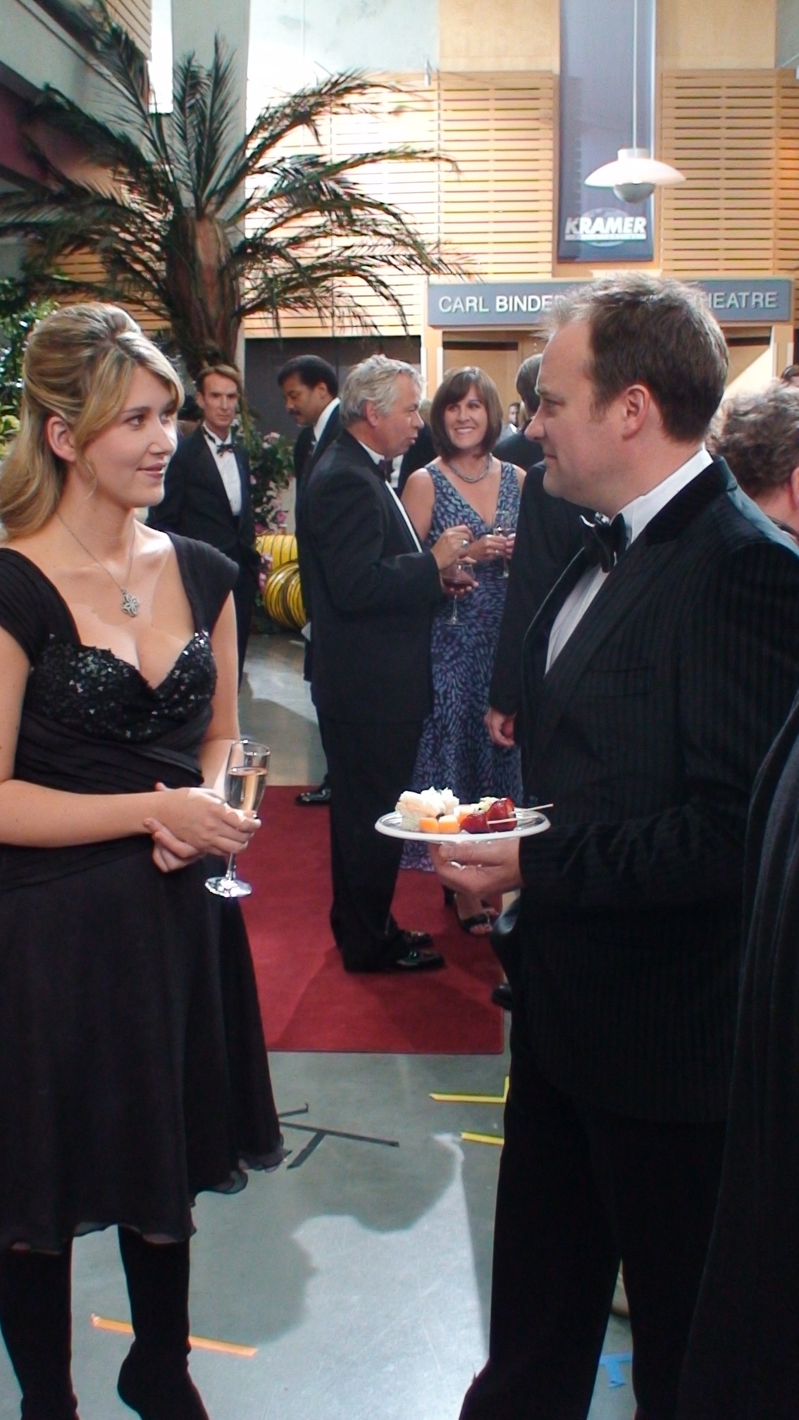 We pulled into the parking lot, right behind Special Features Producer Ivon Bartok who was documenting Martin Gero’s foray into the dark side of directing, and followed him into the high school – down a flight of stairs, around a corner, and into the gymnasium that – through the magic of television – had been transformed into the Carl Binder Memorial Theatre. Extras milled about in tuxes and cocktail dresses while Marty G. set up his next shot. Jewel Staite looked, well, nothing short of drop-dead gorgeous in her evening best while David Hewlett exuded the roguish charm of a nerdy James Bond in his flash jacket and pants. Sitting by the monitor was former Kids in the Hall/News Radio alum Dave Foley who, for reasons unknown, had been given a way-too-early call and was good humouredly killing time until his first scene. As we were chatting, I received a call from the production offices informing me that a network employee named Averie was a HUUUUGE Dave Foley fan and would it be possible for me to get him to sign something, anything for her? Hearing this, Dave suggesting going one better. So, I phoned up Claire at SciFi who put me through to Averie’s cell. Unfortunately, I got her voice mail. “Hi, Averie,”I greeted her. “This is Joseph Mallozzi, the show-runner of Stargate Atlantis. I hear you’re a big Dave Foley fan. Well, I have Dave Foley sitting right here.”