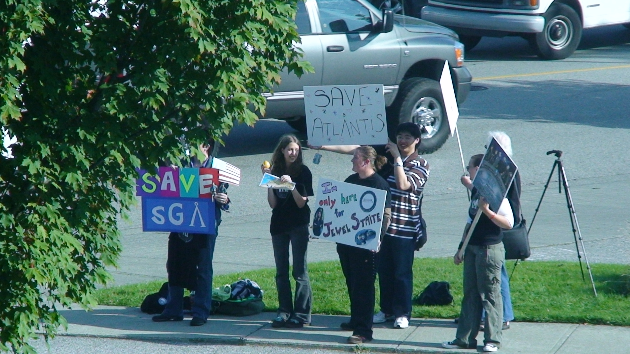 Yesterday, The Bridge Studios was the scene of a massive fan protest. Well, massively spirited anyway. When I rolled in first thing Friday morning, there were three hardy souls outside the gates. An hour later, that number had swelled to five, then eight, then ten, then back to eight (when it turned out that the two we’d counted from our office window were actually a reporter and cameraperson covering the event for SFU campus news), then back up to ten. The turn-out may have been small, but those who showed were very animated, waving signs and exhorting passing motorists to honk. Many did and I hope that most of them knew what, exactly, they were honking in support of, but I suspect that more than a few whizzed by wondering “Save sga? What a sga?”
