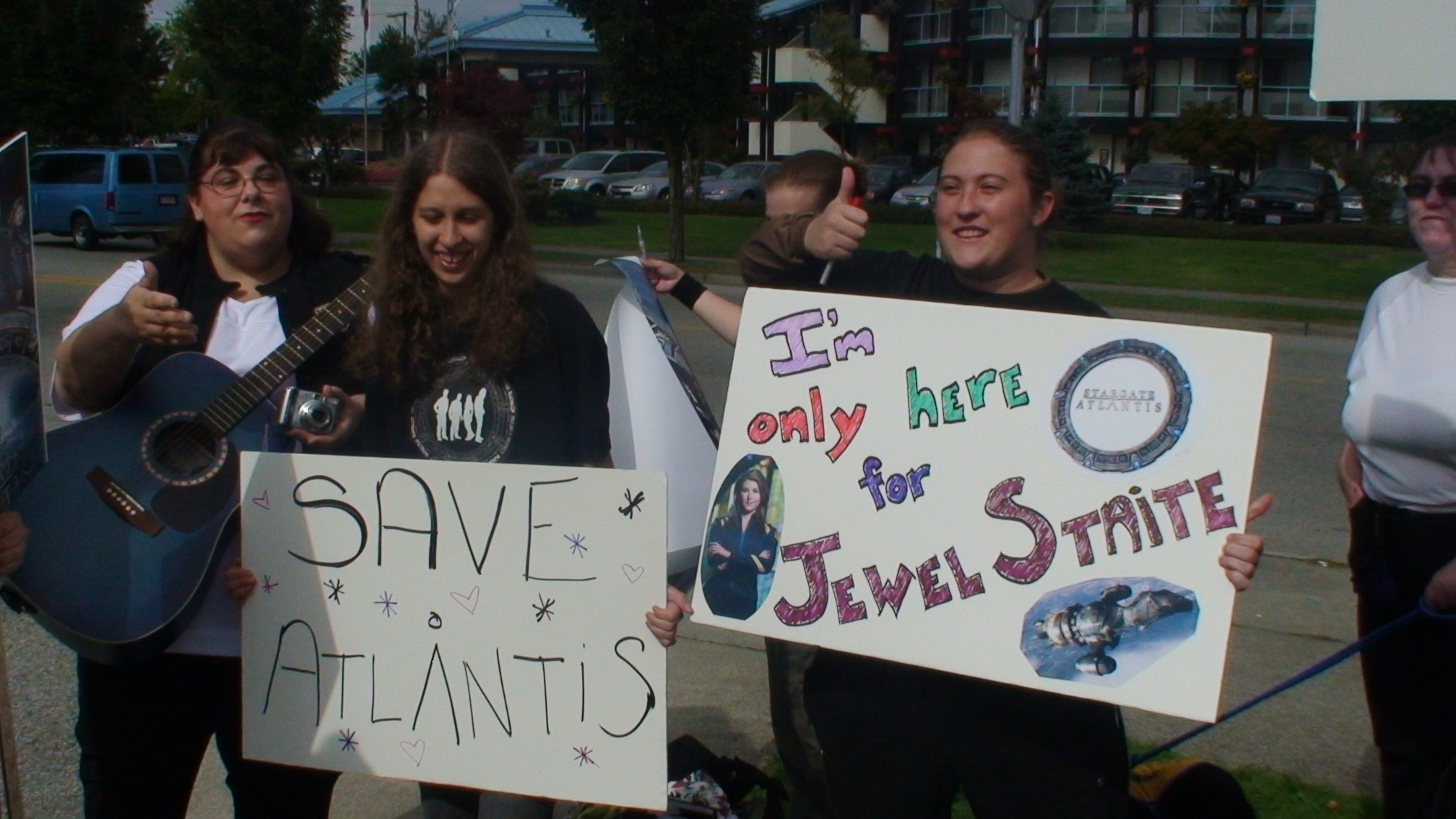 Yay for the fans who showed up to support the show! Especially the person who thought to bring the sign that said they were there to represent the other 1.4 million of us who couldn’t be there. *grin* It would have been truly tempting to drive the 6 hours one way to join them, but I’m here lending moral support to my Mom who just had bi-lateral knee replacement surgery instead.