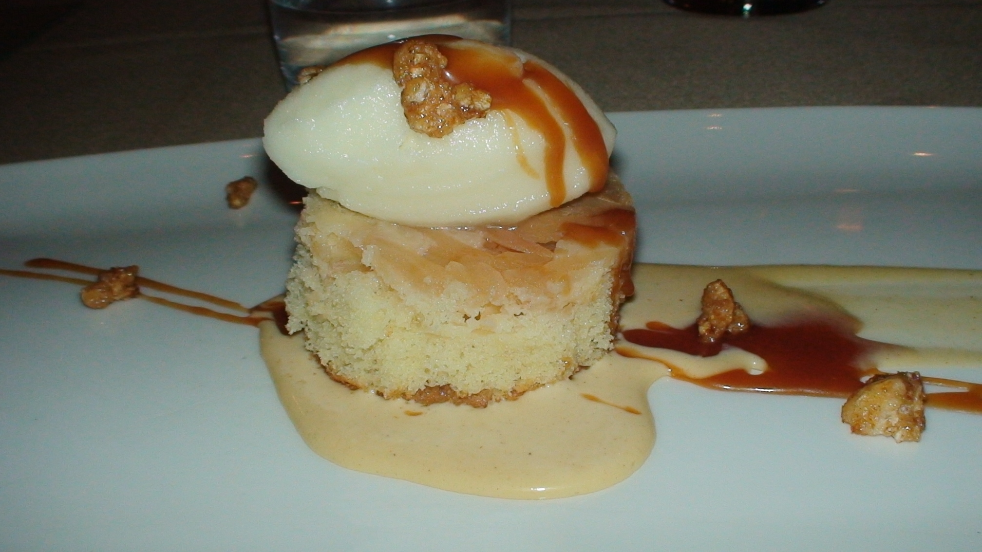 Our fifth course was the Gravenstein Apple pound cake with bacon and calvados. Interesting. I was wondering how they were going to work the pork angle into dessert. No doubt well aware of my general distaste for fruit-based desserts, Ted swung by the table beforehand and gave me the heads up. I explained that, in fact, it‘s not so much the fruit I have a problem with as its unpleasant tartness. Truth be told, I’ve enjoyed desserts that incorporated bananas, figs, blueberries and, on one rare occasion, even raspberries. As for the dessert on this night – I thought a little dessert bacon goes a long way otherwise the dish was fantastic and well-deserving of a spot on the regular dessert menu rotation.