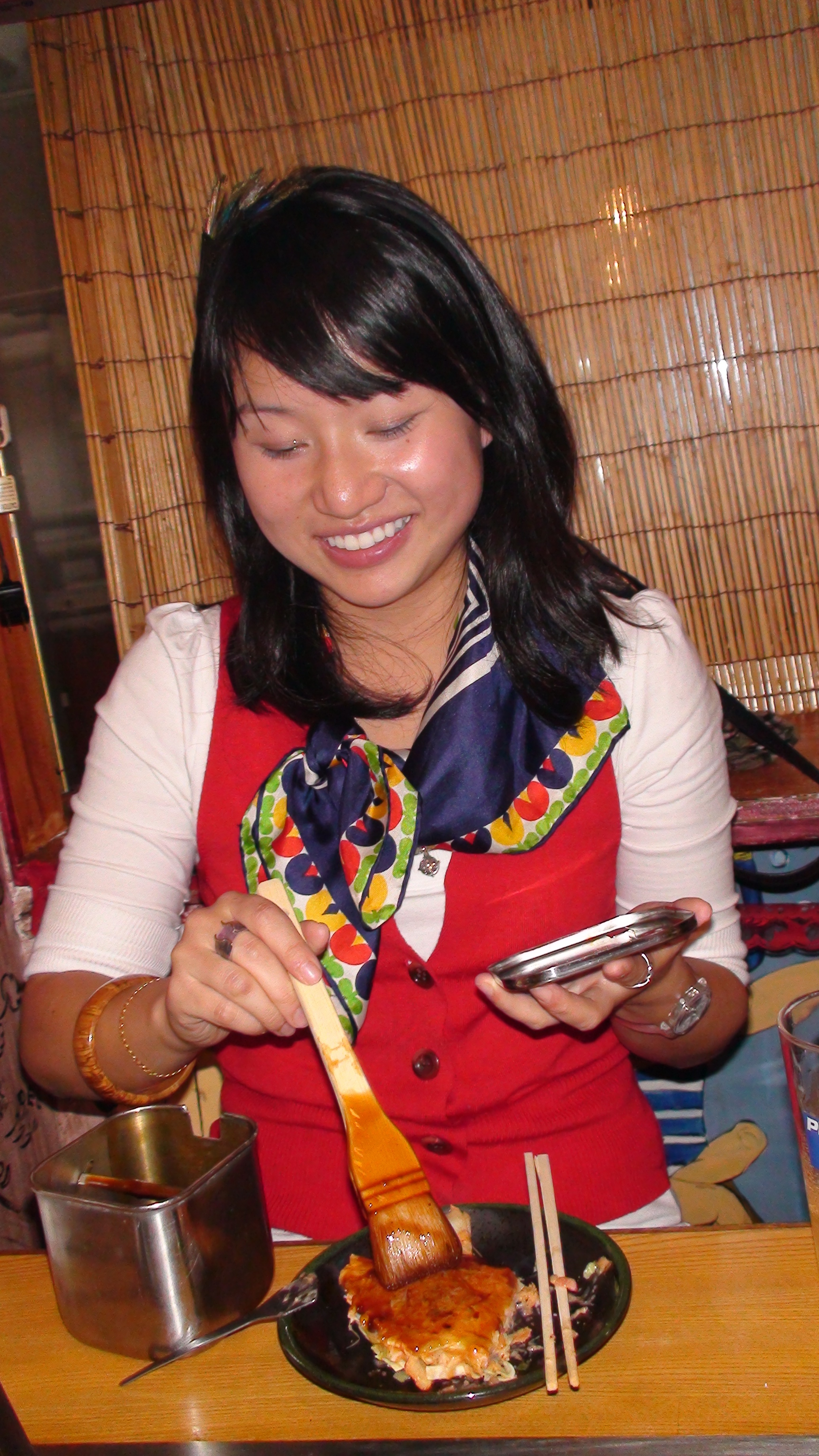 After waiting in line for some twenty minutes, we were finally seated in a room that I suspect as decorated by somebody’s crazed uncle. Wacky, occasionally rude cartoons graced the walls. Pez dispensers and action figures adorned the various nooks and crannies. A Cheech and Chong plastic light-up display hung behind our table which sported a large grill at its center. Apparently, we were expected to cook our own lunch. Fortunately, our menu came with English okonomiyaki preparation instructions. Unfortunately, we still couldn’t understand them. Fortunately, Jessica charmed our waiter into, at the very least, making the monjayaki for us. It was…well, certainly as goopy as I’d been led to believe. But the crispy underside was pretty good. His work done, the waiter served us our okonomiyaki ingredients and then left us to our own devices – at which point Jessica took charge, mixing everything up in the bowl and then dropping the entirety onto the skillet and shaping it into a nice, fat thingamablob. She fried it on one side for five minutes, expertly flipped it, fried it on the other side for another five minutes, and then served it up with a not-altogether-inspiring: “Check to make sure the pork is cooked.”. I’m not sure if it was but, regardless, it was pretty darn good.