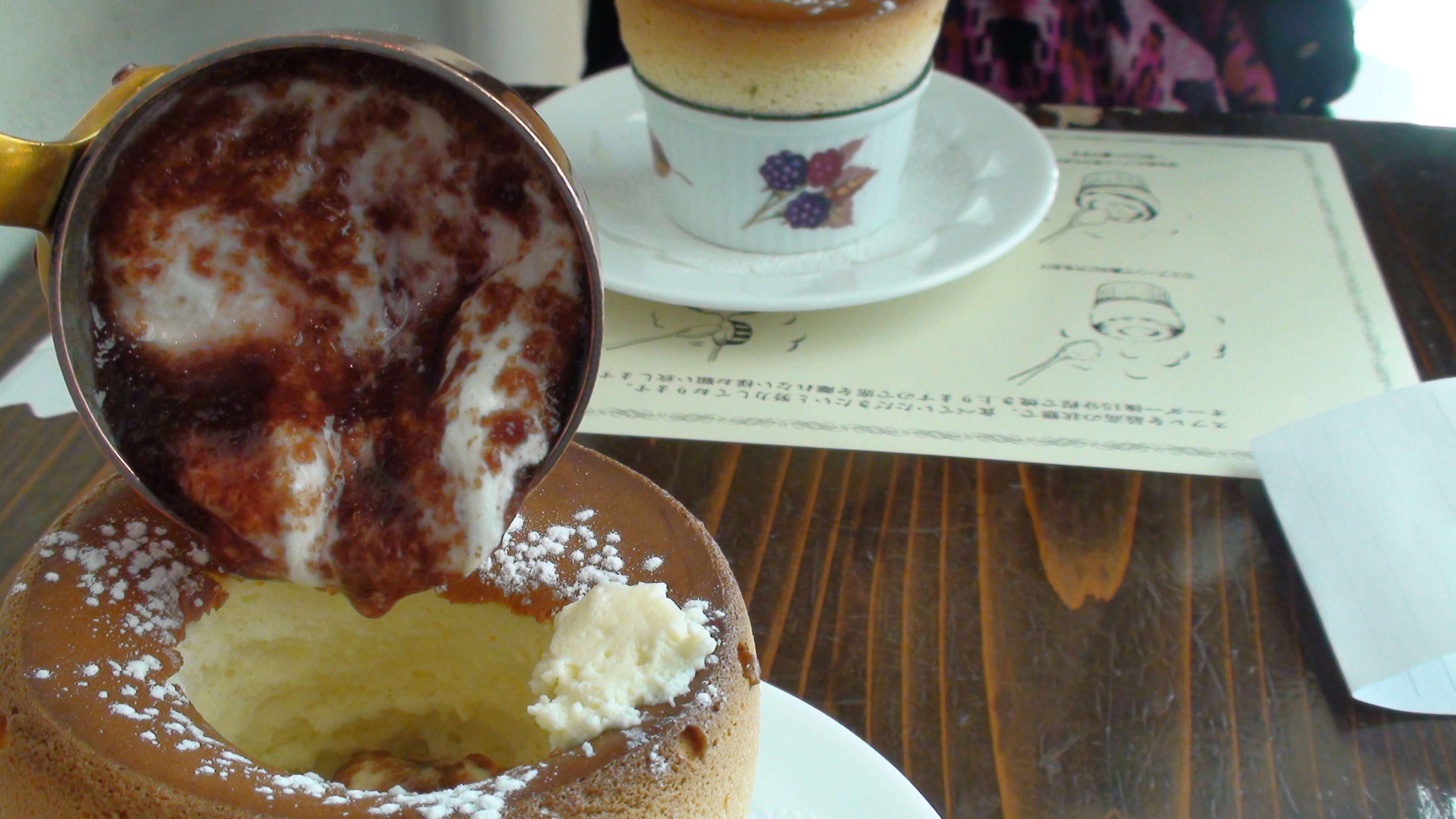 Relieved and more than a little weary, I headed up to the Jiyugaoka Sweets Forest where I was transformed into a modern-day Hansel eating my way through the wicked witch‘s house – and that of her neighbors‘ as well. The dessert-theme park offers a variety of sweets at various stations, ranging from fresh fruit creations to time-consuming soufflés. Our first stop was at a place called Emo-Café where we sampled two desserts: a chocolate mousse and a green tea cake. I thought the chocolate mousse was very nice, smooth and bittersweet, but the center of the dessert contained some sort of glutinous rice paste that spoiled the whole. The green tea cake was a far cry from Sadaharu Aoki’s matcha opera cake but, despite the fact that it was a bit heavy on the butter cream, I did enjoy it. Next up was another dessert station whose name escapes me where we had a blah milk-chocolate banana mousse and a dry flourless dark chocolate cake. Our next stop was Le Souffle where, after a twenty minute made-to-order wait, we were served up two soufflés – chestnut and cream cheese. We were instructed to poke a hole in the soufflés, pour the creamy contents of some copper pots inside, mix, serve, and eat! Despite the wait and the more labor-intensive process, this was, by far, the best of the Sweets Forest offerings. Our next stop landed us at PastaHouse Awkitchen(?) where we ordered a baked sweet potato dessert and an orange crème brulee prepared inside an actual orange. The sweet potato was fine but I felt really pushed the definition of a dessert. The orange brulee was a pulpy disaster.