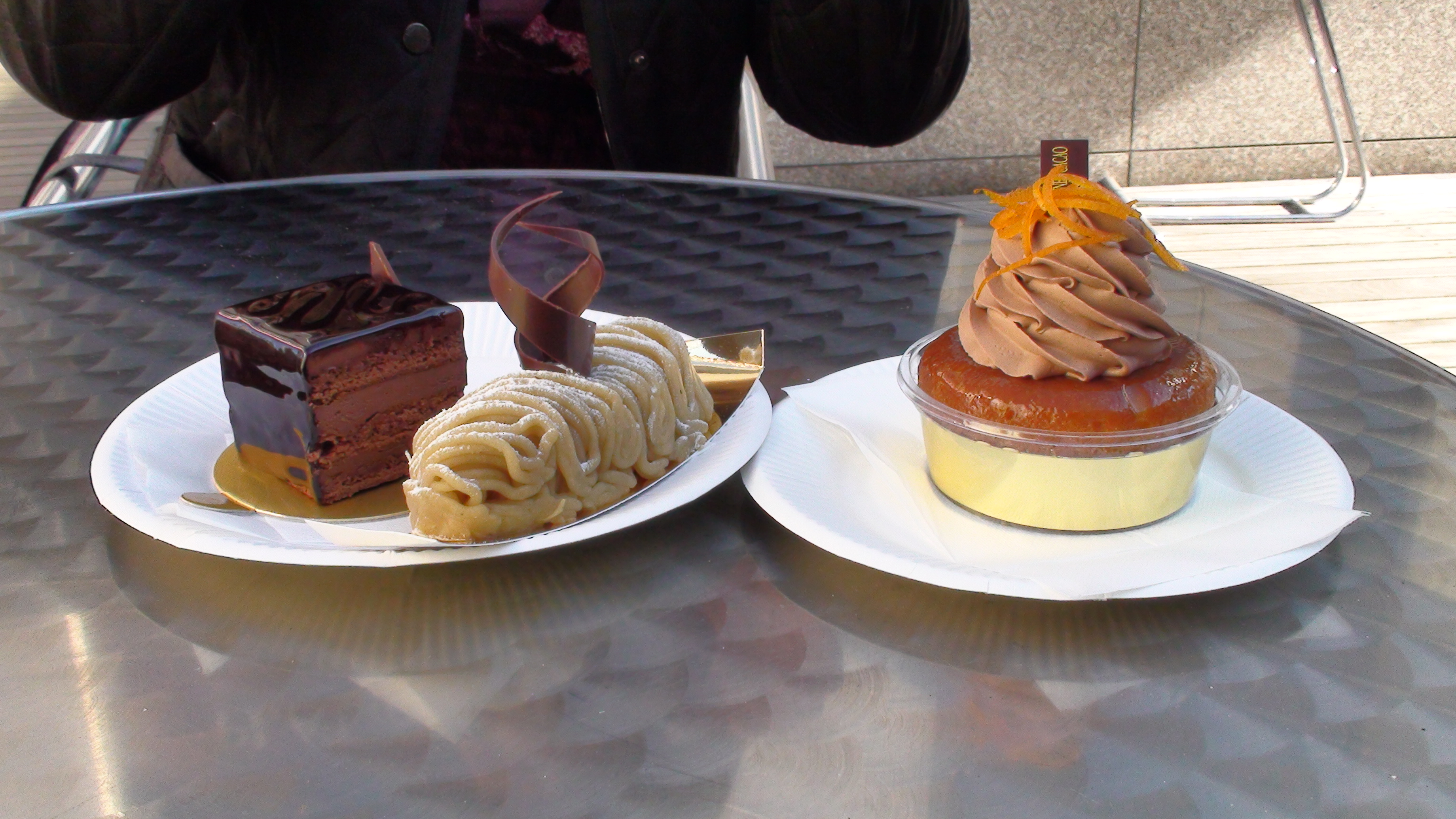 Having had enough of the Sweets Forest, we ventured out and over to the neighboring Origines Cacao and split three very good desserts (a rich chocolate cake, a tasty Mont Blanc, and a golden delicious Savarin), and some not-so-hot macarons (Pierre Hermes has spoiled me!). Then, we worked up an appetite walking two blocks over and dropped into Café Mozart where we had an alright pudding and a second pretty good Mont Blanc.