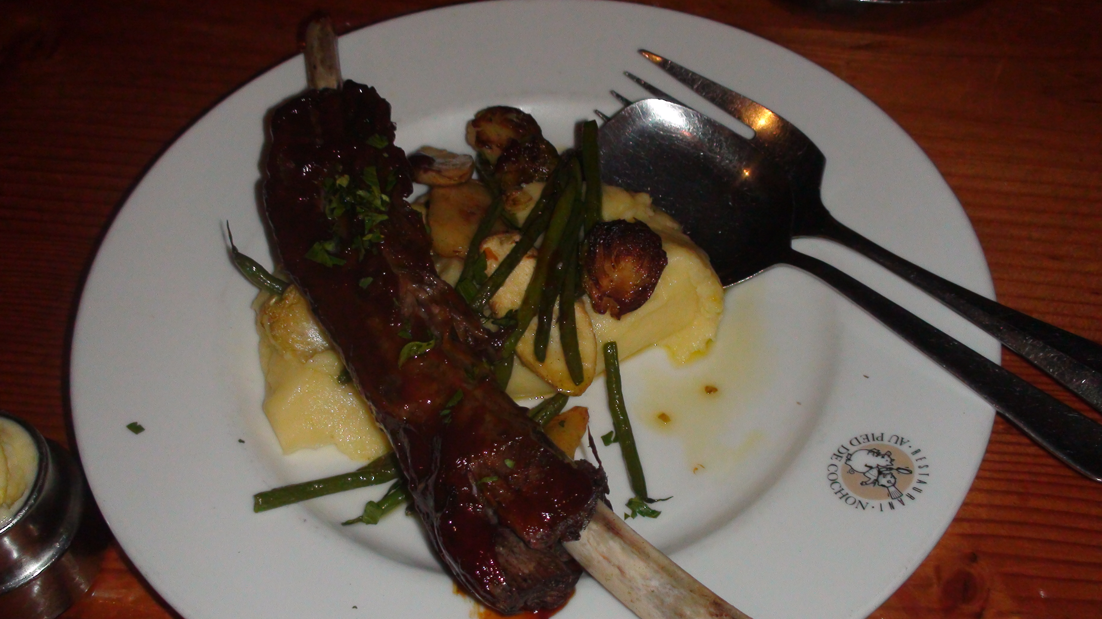 On to round three and three heavy hitters. First up was my favorite of the night, the pig’s feet. The meat was fall off the bone fork-friendly, served with mashed potatoes and a giant cromesquis. Next up was the PDC hotpot which contained a marvelous assortment of sausages, boudin, pork belly, mushrooms, mash, and sweet roasted onions. Our third and final main – and Lawrence and Melanie’s favorite – was the bison rib, a huge tender hunk of meat the likes of which Fred Flinstone enjoyed in his heyday.