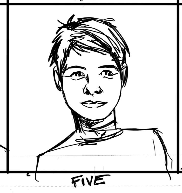 FIVE: Twelve year old, precocious ship mascot. More pixyish, tiny, with a pixy cut.