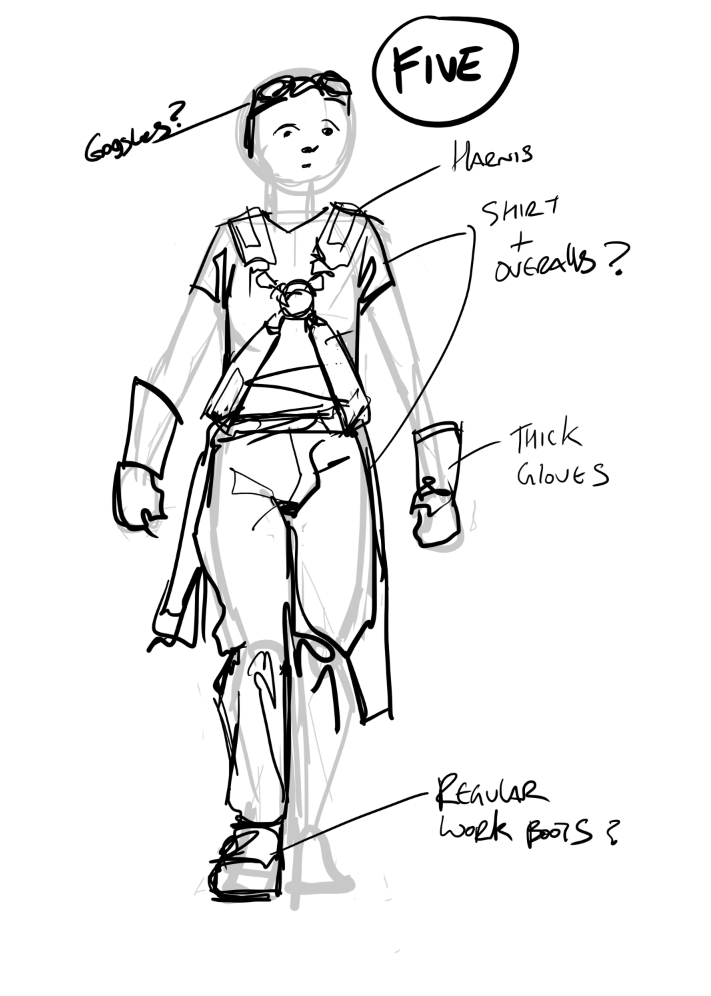 Not sure about the heavy work gloves for character 5 but then you know more about her than we do at this point so maybe they are really perfect for he role in the story; I love the goggles and work boots. She kind of reminds me of my daughter – all she needs is a black tee-shirt under the overall/vest combo.