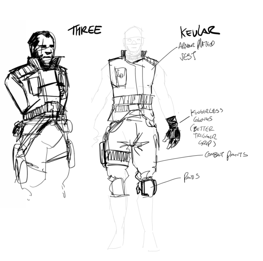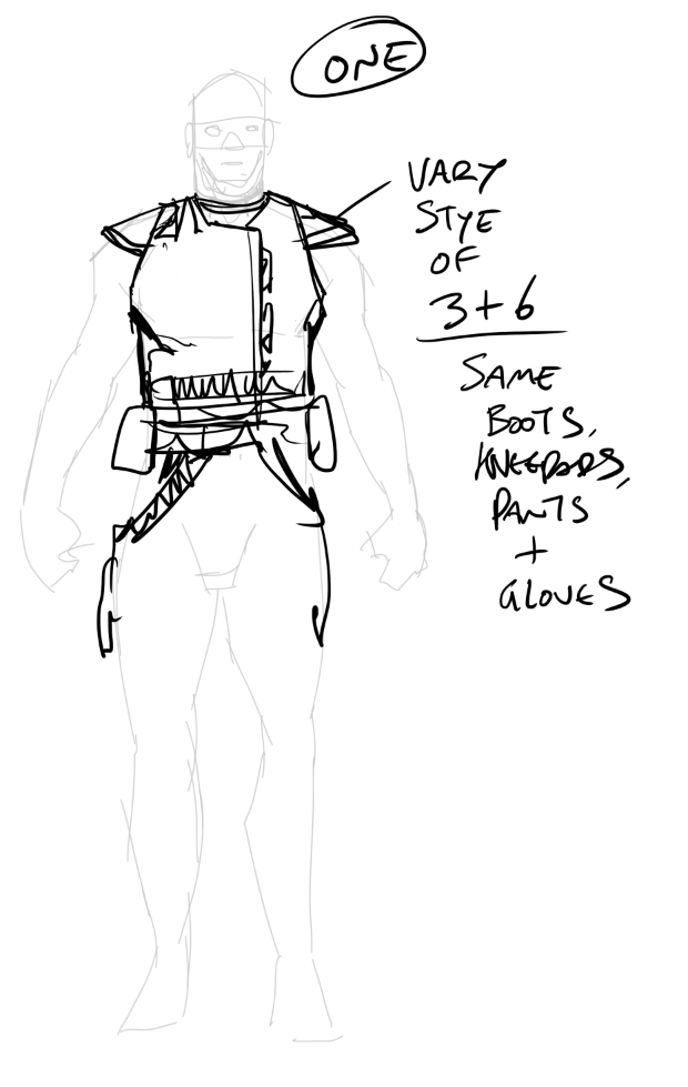 THREE is our resident bad-ass and his clothing should reflect his roughneck persona. Again, functionality is key for a guy whose most cherished possessions are his wicked sidearms. The fingerless gloves are a terrific touch, suggesting a desire for the heady tactile experience of squeezing a trigger.