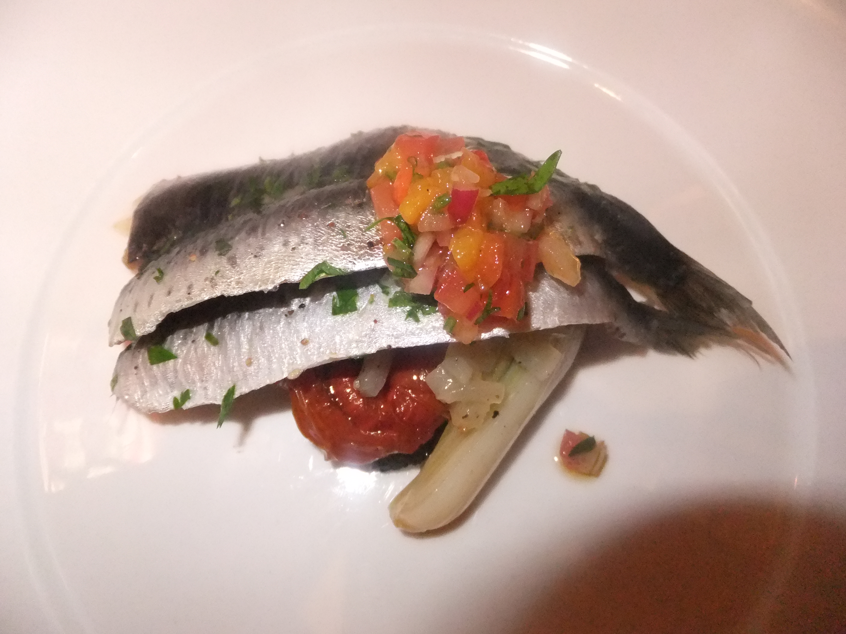 Sardines marinated with lemon, parsley and extra virgin olive oil. We had a choice between raw or grilled and went with the former. And, boy, that was the right choice. Simply prepared but packed with flavor – not fishy (as I feared) but rich and somewhat sweet. Excellent.