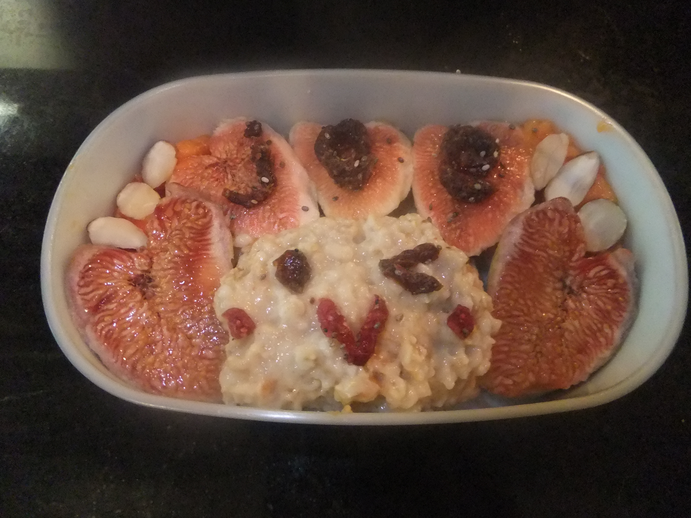 Note the heart-shaped figs, my name in chocolate on top, and the oatmeal wink. Totemo jozu as the Japanese would say!