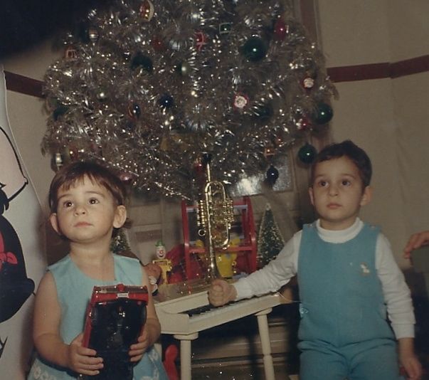 Sis and I and our glorious Christmas tree. For years, whenever the holidays approached, we would assemble the silver monstrosity, happily slotting the tinsel-festooned metal rods into place and then adorning the whole with blue balls – until my sister eventually complained and we ended up getting a real tree, much to my disappointment.