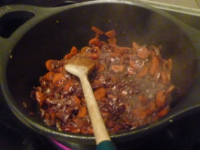 Step #3: Prepare your mire-poix. Chop carrots, celery, sweet onion, and garlic, and sweat them over medium heat for about ten minutes until they start to brown. Season with salt and pepper. Add a tablespoon of tomato paste, then strain the marinade and add it to the pot as well. Turn the heat on high and allow the liquid to reduce by half. Add a spoonful of brown sugar and mix. I also add a couple of cups of veal demi-glace (a luscious dark brown roux and veal stock) I pick up at my local butcher.