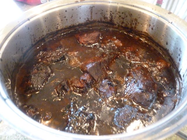 Step #6: Layer the bottom of your pot with the meat, then pour the braising liquid over top. Make sure the meat is completely submerged. Add beef stock if necessary.