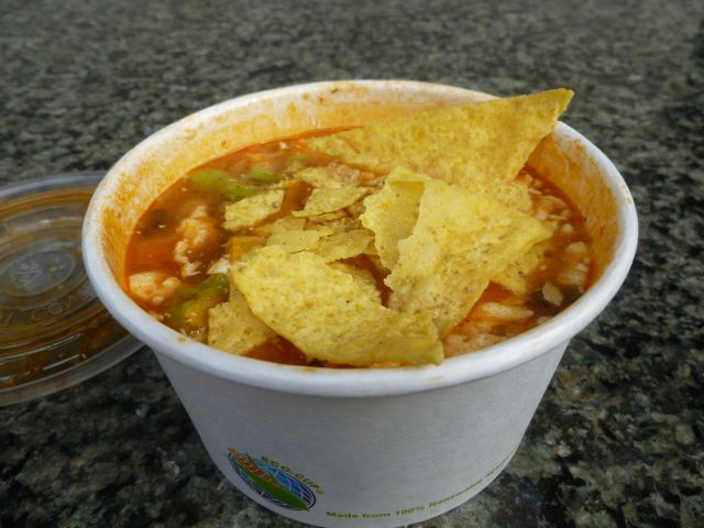 Ashleigh demonstrates true street eating prowess by choosing the cumbersome and unwieldy tortilla soup. She’s had it before though and gives it the thumbs up.