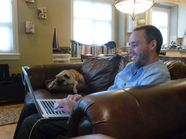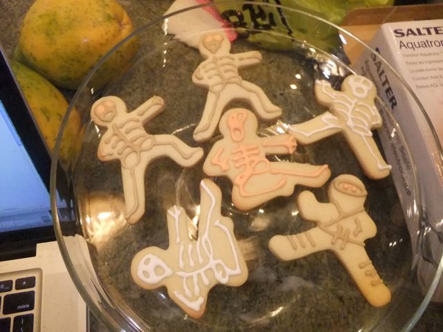 Lawren keeps track of his team's play.Jelly keeps track of Lawren keeping track of his team's play.Ivon's team, The Running Dead, is poised to claim a rare win and vault into playoff contention.A day of highs and lows for Lawren. Lows = his team's play. Highs = the company, of course.Ivon brought over dessert. I was initially dubious. As it turned out, the little lemon things weren't terrible.I preferred Akemi's sweet potato cakes.Not to be outdone, Lawren baked up some spookerific treats of his own.
