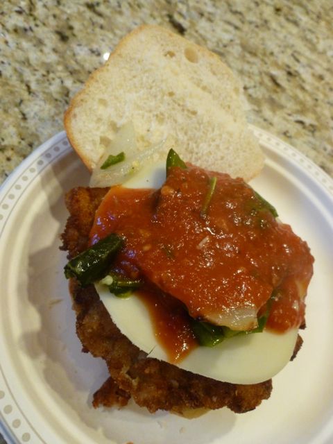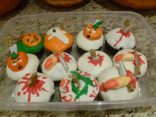 Rob, decked out in appropriate attire, mans the oven.Veal schnitzel sandwiches with cheese, spicy peppers, grilled onions, and parmesan sauce. I told Rob he should get his own food truck!While we were on the edge of our seats, watching the Snow Monkeys pull of an improbable win, Rob's kids were upstairs - totally oblivious - making what I assumed where celebratory cupcakes but turned out to be Halloween cupcakes. For tomorrow. 🙁I particularly like the detail on the severed finger.