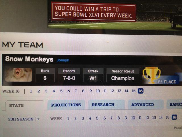 It’s the final day of the NFL regular season. Teams are battling for their playoff lives and yet it all feels, well, anticlimactic. After all, the real superbowl – the one that really matters – was played last week. And my Snow Monkeys finally got their trophy…