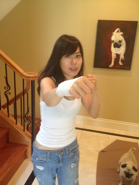 I love the painting of your dog on the wall. Poor Akemi’s hand! But it looks like she can take anyone on 🙂