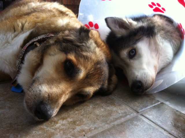 Some of you were wondering about my sister’s dog, Aspen, who made an appearance in yesterday’s blog – a video of him following his post-chemo treatment, clearly feeling a little zoned-out. Well, here’s the update. In early June, the poor boy was diagnosed with prostate cancer that had metastasized to his bladder and lymph node. He started chemo and, after a full round, he was switched to daily leukeran chemo pills. Pictured below, Aspen following one of his treatments, receiving some TLC from his buddy Roxy.