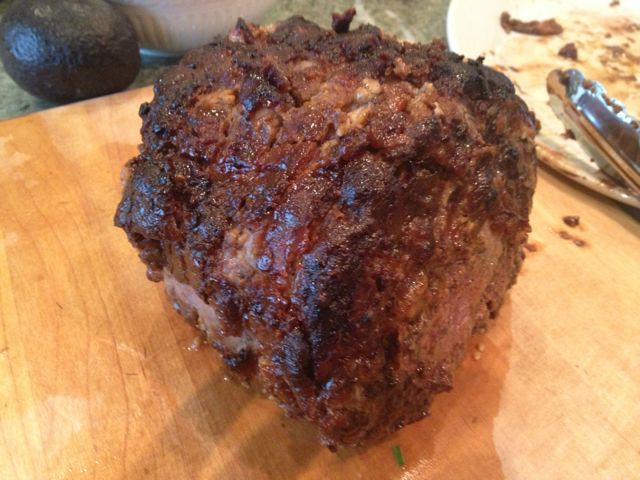 I made a rib-eye roast for lunch. After leaving it out for 30 minutes to bring it to room temperature, I dusted it with a mixture of black pepper, fresh thyme, hot paprika, bacon salt, and flour, then made some pierced the meat and slipped garlic slivers into the incisions. I seared it off and, once I’d achieved that night, crispy exterior, I brushed it with honey-mustard and then roasted it for an hour and twenty minutes at 325.