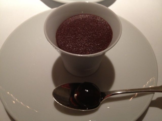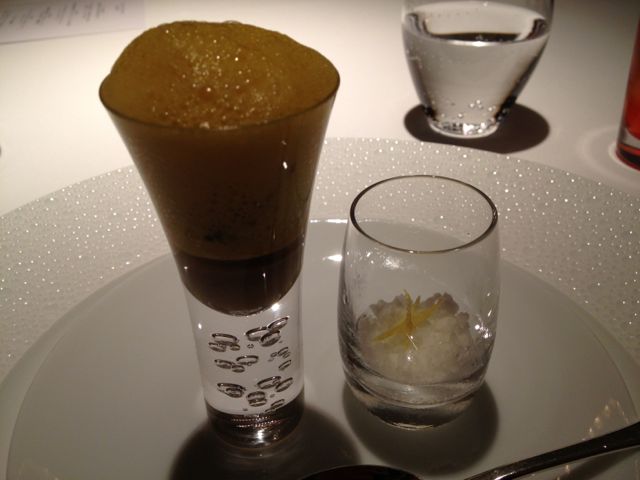 Their version of kinpira (burdock and carrot) with a touch of yuzu, topped with a foam confrere and accompanied by some yuzu ice. Apparently, very natsukashii.