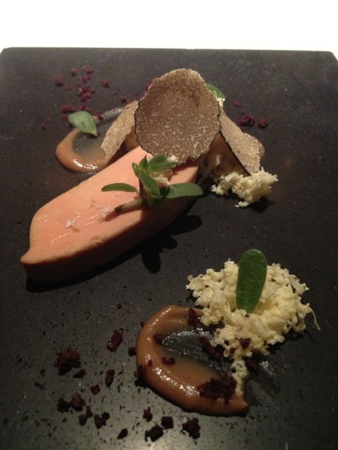 Foie gras with fresh chestnuts, chestnut puree, and black truffles. The foie gras chestnut combination has been a revelation on this trip.