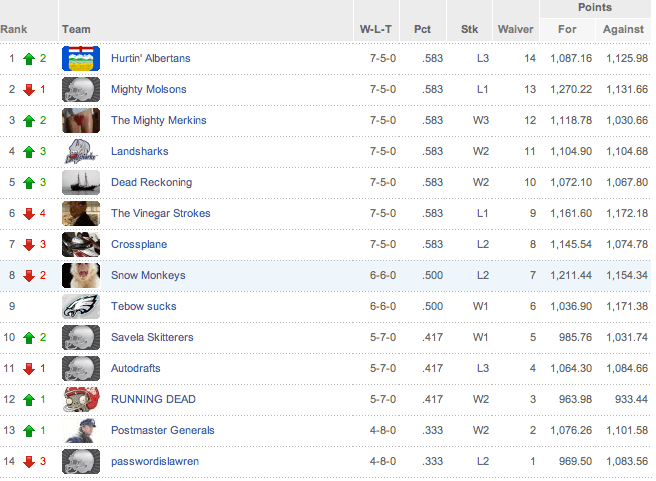 My Snow Monkey, down 30+ points heading into the weekend, came roaring back to to take a 38 point leading into the Monday night game, all but assuring themselves a spot in the post-season. Only to lose by 6 points. The loss leaves us tied for the last playoff spot with one game to play. Ultimately, it’s partly my fault for believing in wide receiver James Jones, partly James Jones’ fault for not putting in a better effort, but mostly, MOSTLY, quarterback Aaron Rodgers’ fault for not once – NOT ONCE! – targeting Jones. Instead, the Packers focused on establishing the run game – DOWN 3 TOUCHDOWNS! Rodgers threw to everyone BUT Jones – and ended up losing the game, and possibly costing my Snow Monkeys their season. If I had played someone else, anyone else – Beanie Well! Malcom Floyd! Ryan Broyles! Daniel Thomas! Hell, even terminally underperforming Dwayne Bowe! – I would have won!