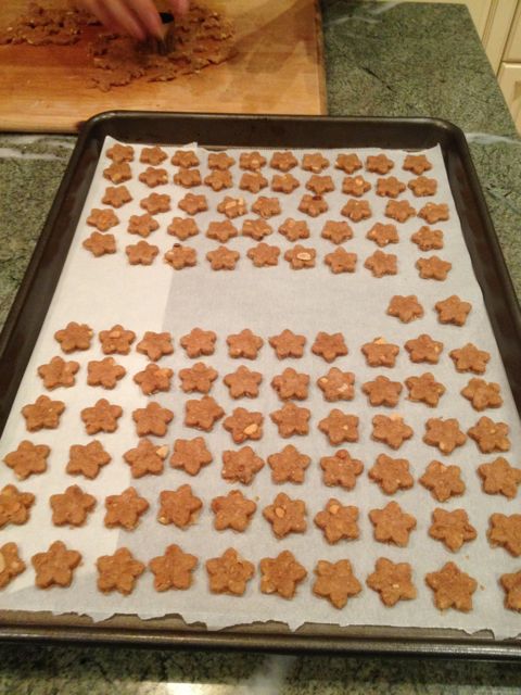 Peanut butter dog cookies. Jelly was positively crazy about them – and I DO mean crazy: barking, pacing, hopping up and down on her front paws, gazing longingly up at the plate. Bubba and Lulu liked them just fine as well.