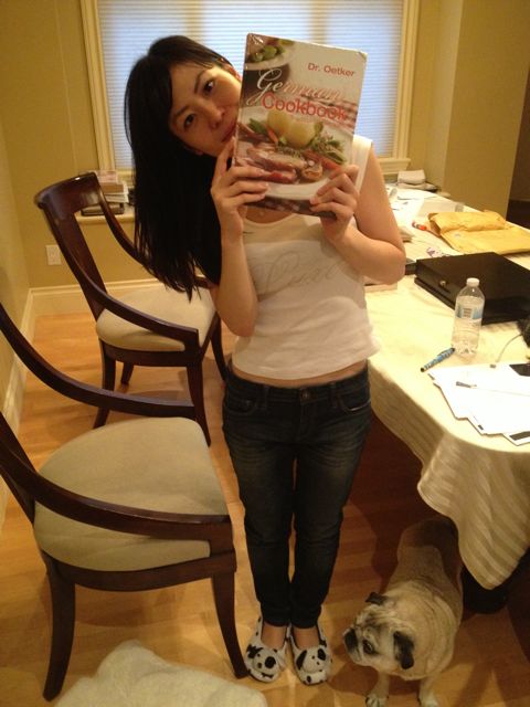 No, not the pug. Or the Japanese girlfriend. Or the Japanese girlfriend’s Dalmatian slippers [note: no actual dalmatians were hurt in the manufacturing of said slippers]. I refer, of course, to the cookbook – a cookbook chock full o’ classic German recipes like gulasch, jagerschnitzel, apfelstrudel. It comes compliments of our friends, Alexander and Sarah, who, clearly, feel I’m not cooking enough Bavarian fare.