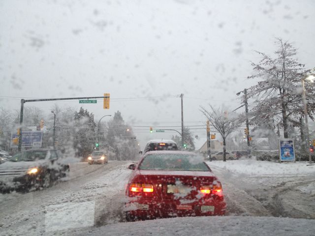 The road conditions were tricky but manageable, paricularly for a seasoned Montreal driver like yours truly who drives a big-ass SUV and had the foresight to switch out his summer wheels for winter tires. Unfortunately for yours truly, it appears that a significant number of Vancouver drivers: 1. Evidently forgot they lived in Canada and 2. Failed to get winter or all-season tires AND 3. Have evidently never driven in inclement weather before. The streets were a disaster. Cars stuck, spinning their wheels in frustration, or advancing at a cautious snail’s pace, commanding both lanes of the two-lane street. I spent half my day in traffic.