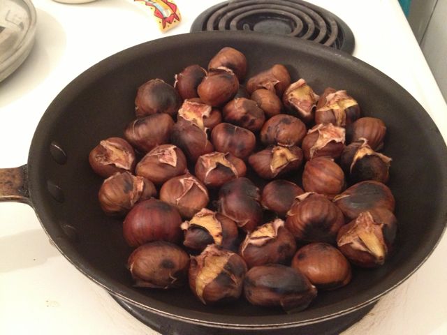 Of the restaurant shots shown, I could eat the hot pot chicken with ginger and mushrooms and the mushroom risotto. Kudos to your Mom, but I will never eat a rabbit. I adore roasted chestnuts and it ever occurred to me to use an iron frying pan. I’ve always used an oven, placed a small amount of water in bottom of pan, covered with foil and baked/steamed them. Now I know an alternative, thanks to Mama Mallozzi!