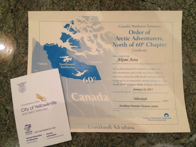 Congratulations to Akemi who has been bestowed the highest honor one can achieve as a tourist visiting Yellowknife willing to pay three dollars for a certificate. She is now and forevermore (unless she misplaces this piece of paper and doesn’t buy herself a new one) “an honorable member of the exclusive North of 60 Chapter, Order of Arctic Adventurers”! All good – until Russia invades, of course, in which case she is legally bound to fight on behalf of the Northwest Territories.