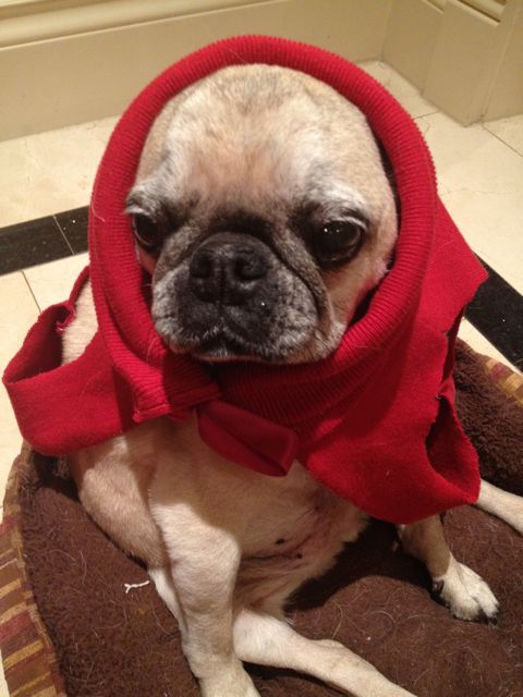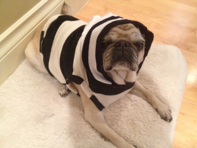 Akemi is a woman of many talents. The outfits are adorable. I know a dog store down here I can approach that sells gourmet doggie treats and other items for the discriminating buyer if you want me to put you into contact. I would never be able to put Maddie in one of these things. I tried to dress her up as a devil one Halloween. It wasn’t pretty. She objected. I even tried putting bunny ears on her. I have a pic somewhere of that. The black-and-white stripe one with the hoodie pulled over makes him look like he just broke out of jail, although it is my favorite among the 3