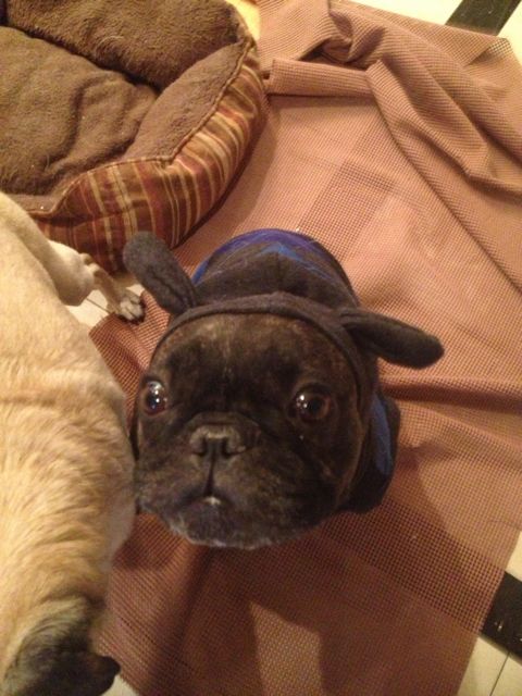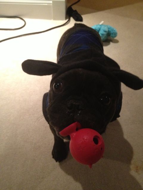 Lulu looks so pleased with her new ensemble that she’s accesorized her outfit with chew toys! Lulu’s expression are priceless: “Play? Play now? Let’s play!”