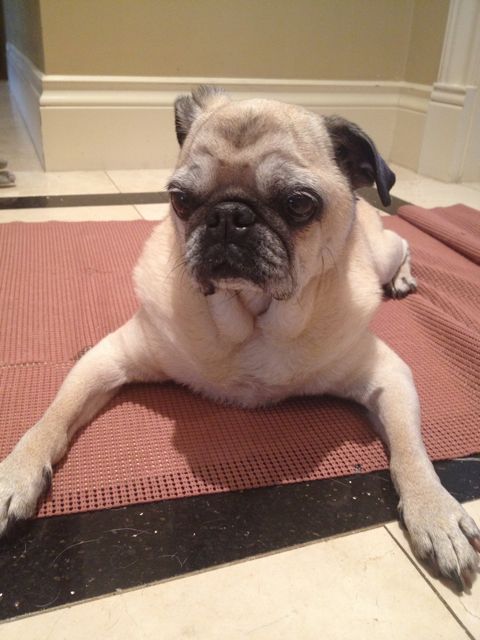 My other, older pug, Jelly, meanwhile, has problems of her own. She is almost certainly deaf (has been for quite some time) and her hip dysplasia makes it very difficult for her to get around, so I’ll often find myself chauffeuring her up and down the stairs, onto and off the bed, out to and in from the back yard. Despite her obvious discomfort walking, she’s in very good spirits, vocal and waggy – but she was decidedly less so the other night. She was sitting on her usual perch atop the pillow beside me when she decided to turn around and get comfy. She shifted, obviously misjudged the room she had, and ended up tumbling off the side of the bed. Fortunately – or not – instead of hitting the floor, she ended up getting wedged, upside down, between the mattress and the night table, crying out until I was able to rescue her.