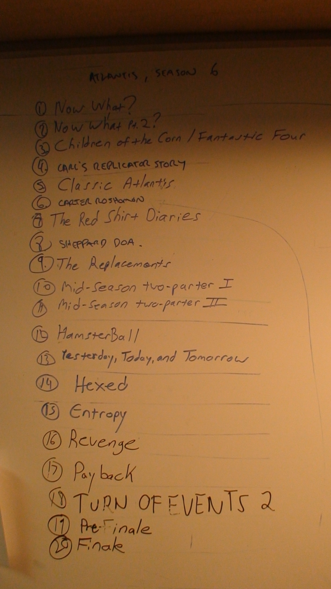 Now that I think about it, I believe 619 and 620, the two-part season finale, would have involved an idea I’d been kicking around involving our team returning from a mission to an AU Atlantis that has been taken over by a mysteriously resurrected Michael, its personnel (Woolsey, Keller, Beckett, even Chuck!) now hybrids in league with their former enemy. Damn. So many opportunities missed!
