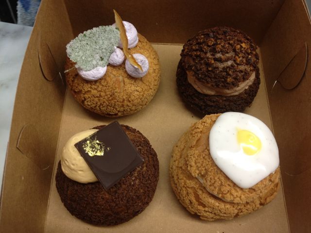 Cream puffs, from left corner clockwise: blueberry-yuzu, praline, banana cream pie, and dark chocolate (85%) and caramel.