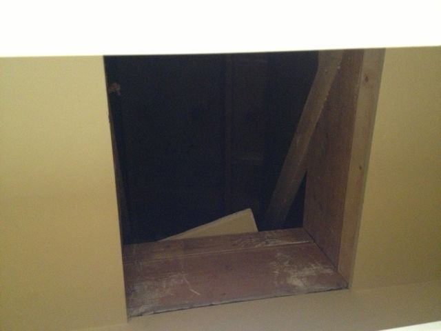 Seriously, it looks like that little access panel in the Japanese version of The Grudge. I imagined poking my head up amongst the shadows and casting my flashlight about before being dragged, kicking and screaming, into the darkness. It’s next to impossible to get up there. You have to stand at the very top of my stepladder, then step on to a wall mounted shelf, hope it holds your weight, and worm your way up and in. No way I was testing my luck. Besides, even if I did go up, what the hell would I do? I’m not a professional.