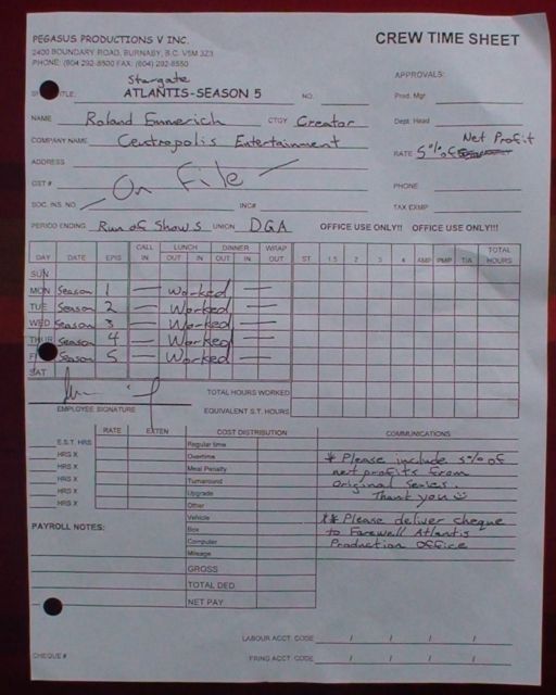 As for Roland Emmerich, I know he has gone on record as stating he isn’t a fan of the television series(s) his movie spawned, but I can’t help but think it has less to do with the quality of the show(s) than it does the t.v. franchise’s very existence scuppering any hopes of another big screen sequel to his original. And, for what it’s worth, he strikes me as a guy with a great sense of humor. A couple of years ago, he was shooting his apocalyptic feature, 2012, at the Bridge Studios. Despite being in the neighborhood, he never actually stopped by the set (which is a shame since he would have been more than welcome) but the accounting department did receive this mysterious time slip: