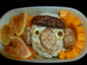 Food with eyes…. now and then it is cute, but tonight I will dream of an army of angry bento creatures bent on sweet revenge. And the happy okonomiyaki, will it still be happy in my tummy? I did not need to see them all assembled together.