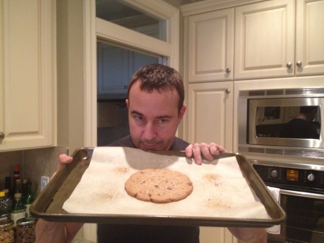 I like it when Akemi bakes, but I LOVE it when she “experimental bakes”. By that, I mean when she decides to try out a new recipe or compare slightly different versions of the same dish. This morning, for instance, she made three different types of cookies: white sugar and whole egg chocolate chip cookies, white and brown sugar and egg yolk chocolate chip cookies, and chocolate and peanut butter cookies. The verdict? While all three were very tasty, I informed her I would require a bigger testing sample in order to complete a more thorough study and arrive at a scientifically sound conclusion. Unable (unwilling?) to recreate the conditions of the first experiment, she made me a BIG cookie instead. Verdict? Delicious!