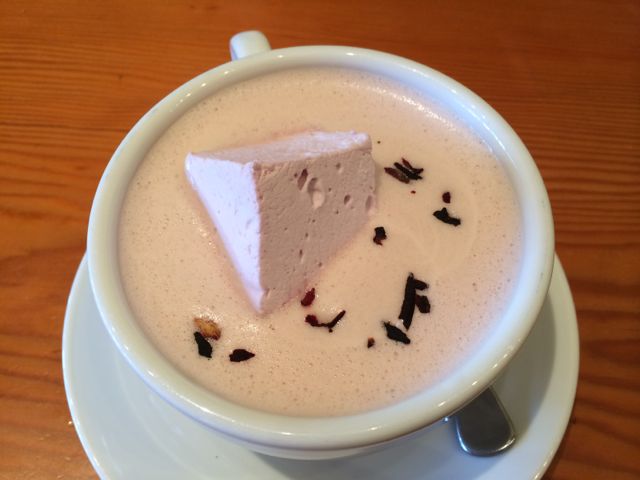 Aloha Sweetie: Barry Callebaut White Hot Chocolate with hibiscus flower. Served with mountain berry marshmallow and lemon sugar cookie.