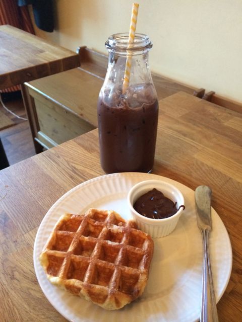 While the regular iced chocolate drink was great, this one, fairly bursting with coconut flavor, was even better. Initially, I feared the flavor might stray into cloying Pina Colada territory but it turned out to be surprisingly strong in chocolate flavor as well. The warm local waffle serve with the home made hazelnut spread was to die for.