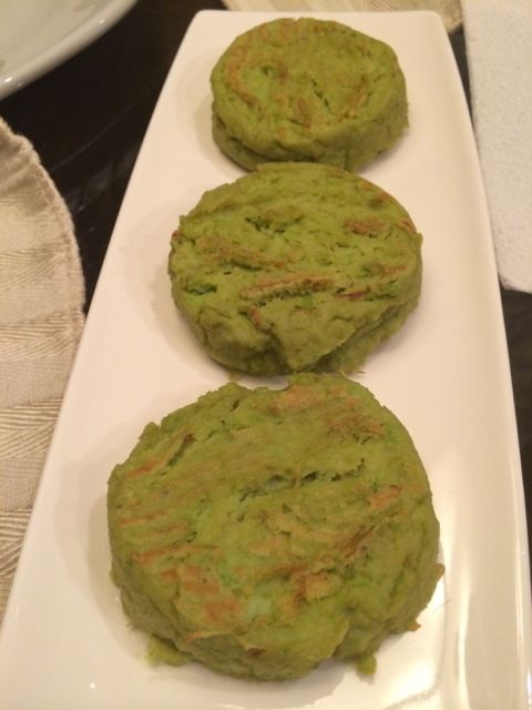 Avocado-edamame cakes inspired by a recent episode of Iron Chef America. I say inspired because the show never offers exact recipes and I couldn’t find one online so we winged it – with mighty fine results.