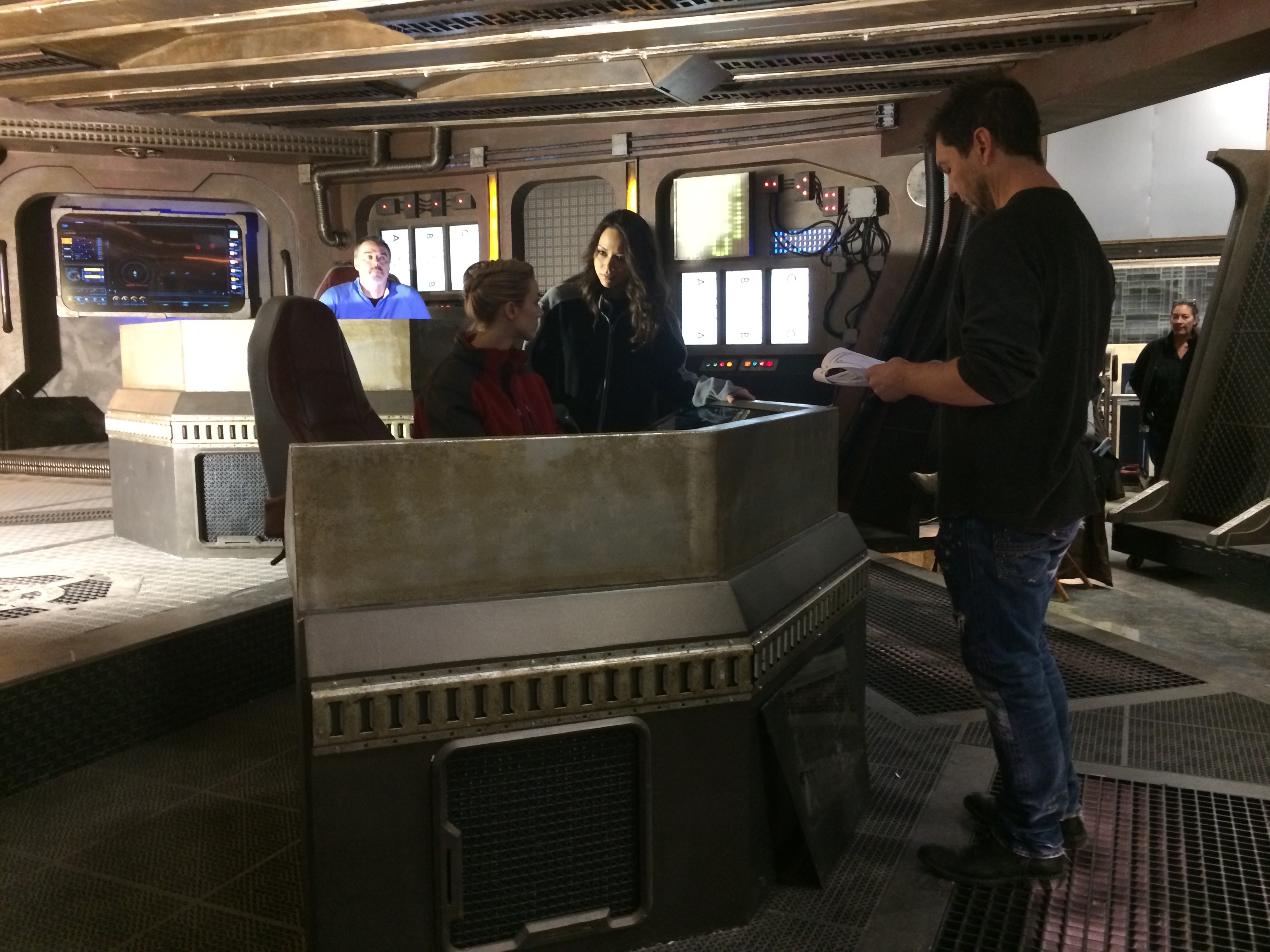 T.J. Scott directs Zoie Palmer and Melissa O’Neil in a scene (“No. Show me.”) from Dark Matter Episode #101. Executive Producer Paul Mullie looks on in the BG, hoping for a cameo.