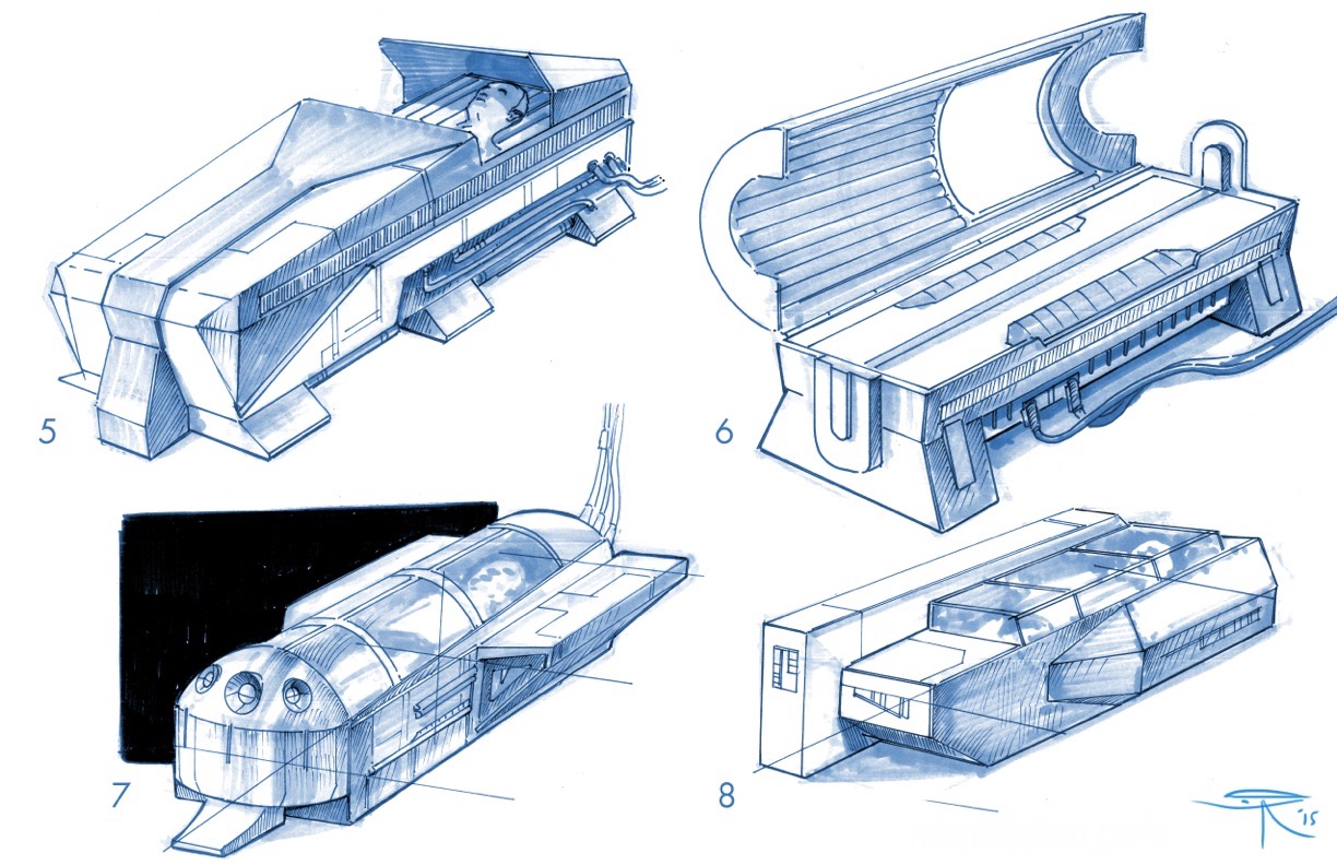 First I’d have to know function. Generic long term stasis pod? Sleep pod? Detention stasis pod? Medical diagnostic & potentially treatment pod? Transfer transit pod upgrade? A pod that can also be a ship escape pod? My favorites are 3, 2 & 7 in that order. And yes I admit I first thought of the stasis pods in Aliens, Alien, Event Horizon, Supernova & Earth Star Voyager. #2 reminds me of the cockpit of a BSG Viper. That’s probably why I like it so much. I say go with the pod that’s most aesthetically pleasing, functional for filming & the actors & easiest to manufacture i.e. cost effective so money can go to other effects.