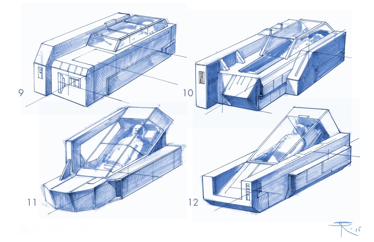 The pods aren’t doing it for me. Perhaps it’s the sketches. 6 does look like a tanning bed, but it also looks the most practical… Perhaps because it does look like something we know already. I do prefer its rounded look – it appears more ‘modern’ than the others. The others just seem too 1980s sports car-ish. All but 6 look more like miniature shuttles. I sort of like 5…I wonder how it would look with some of the edge taken of the corners so it doesn’t look so 80s’ box-y. But I like the head shield, the lack of consoles around it (making it easier to stand anywhere next to it), the use of less glass and more concealment, and that it is flat (pretty sure the tilted ones would be edema-inducing). Yeah… leaning towards 5.
