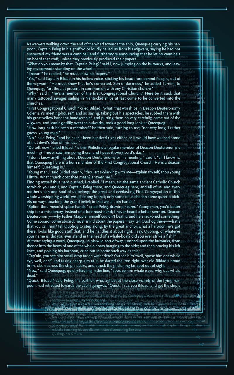 That text excerpt looks like Moby Dick, based on the characters’ names. But, I’ve actually read it before and reading that makes it look like it’s not an easy read at all. Before I started seeing the recognizable names, I actually thought it was nonsense text!