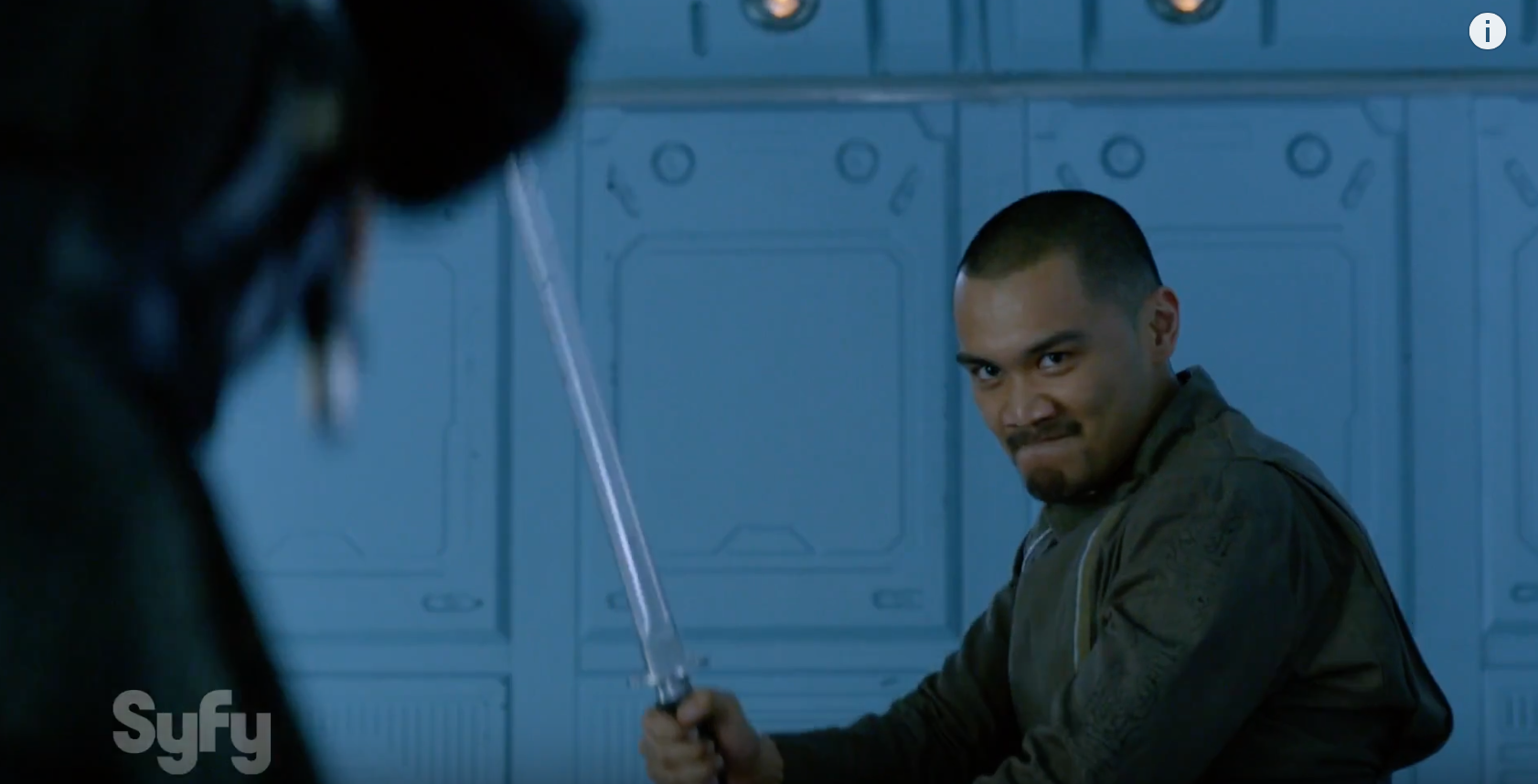 SHOT #2: FOUR asks “What happened to us?”. And it’s pretty clear he’s addressing TWO. Are we to assume this shot follows the preceding opening shot? And do both follow somewhere on the heels of last season’s explosive finale? Last time we saw our intrepid crew, they were unconscious, being dragged off The Raza by the Galactic Authority. Is this them waking up?