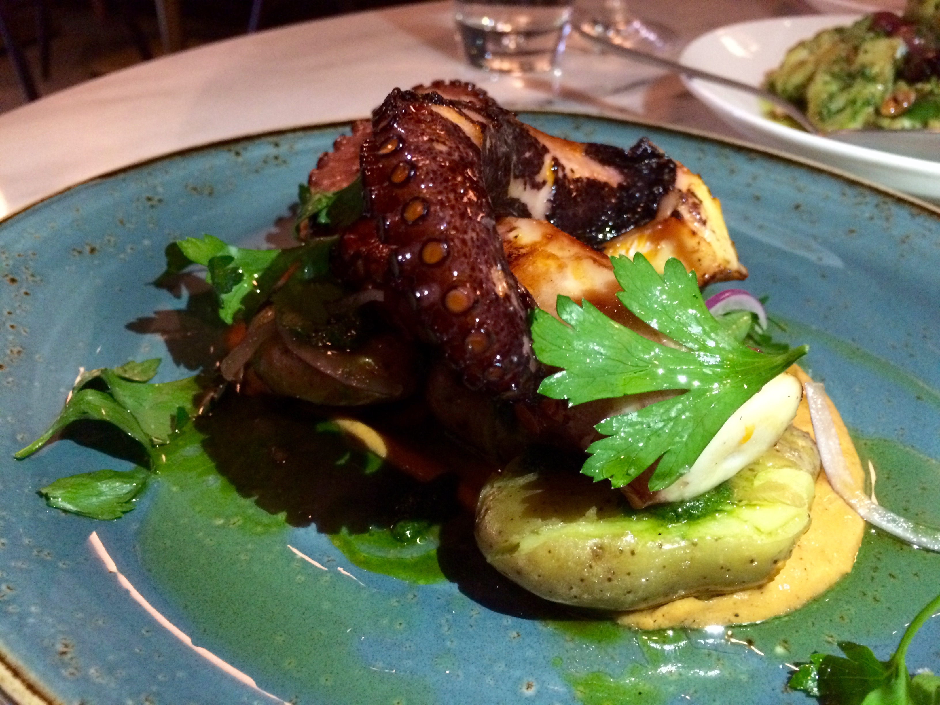 Grilled octopus, fingerling potatoes, romesco, salsa verde.