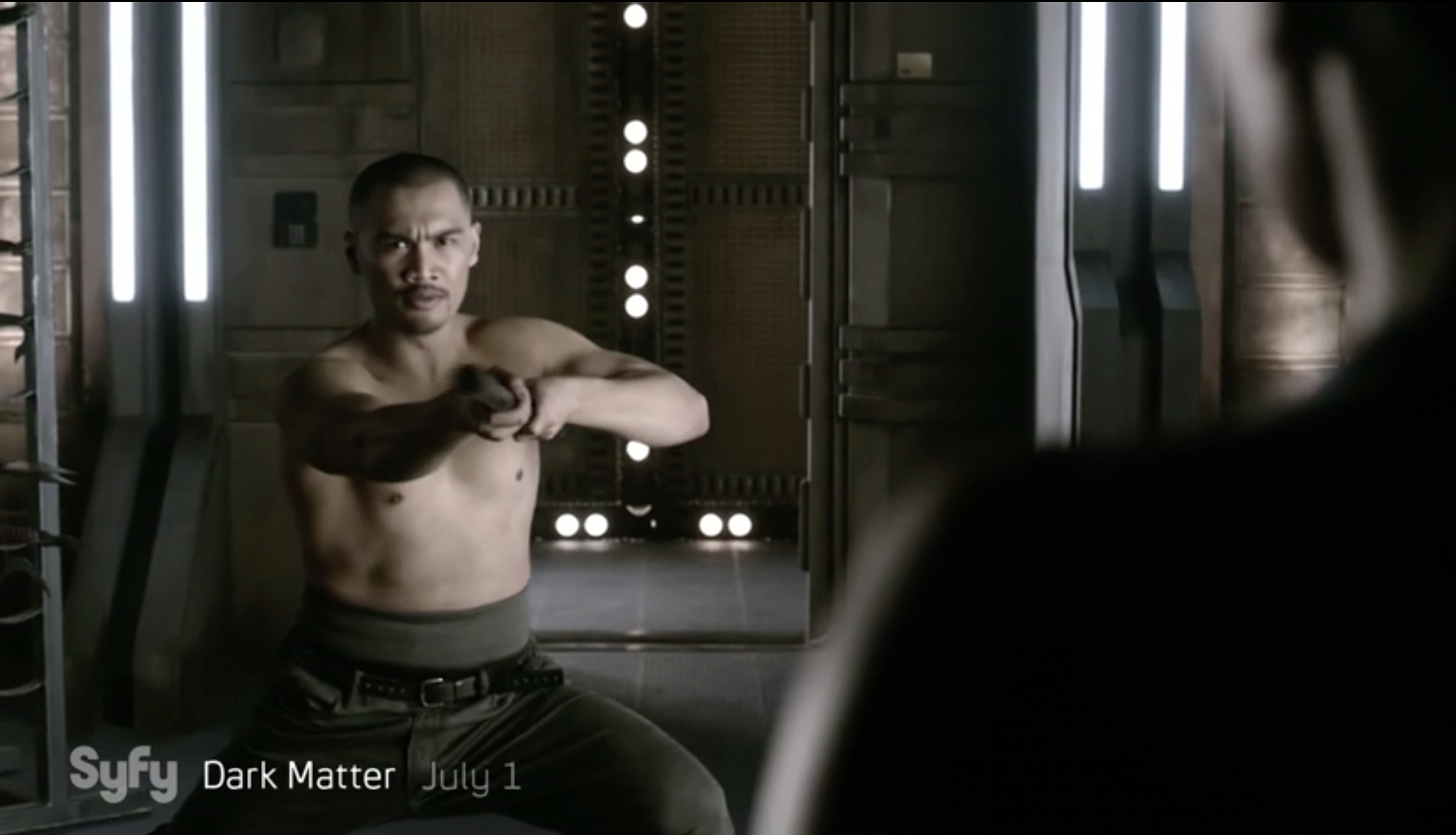 “When you can’t trust your friends…”says the voice-over, over a shot of a distrustful-looking THREE flanked by a mysterious individual (who, if you’ve been following the recent Dark Matter developments, recognize as the new ship’s medic, Devon, played by Shaun Sipos)…